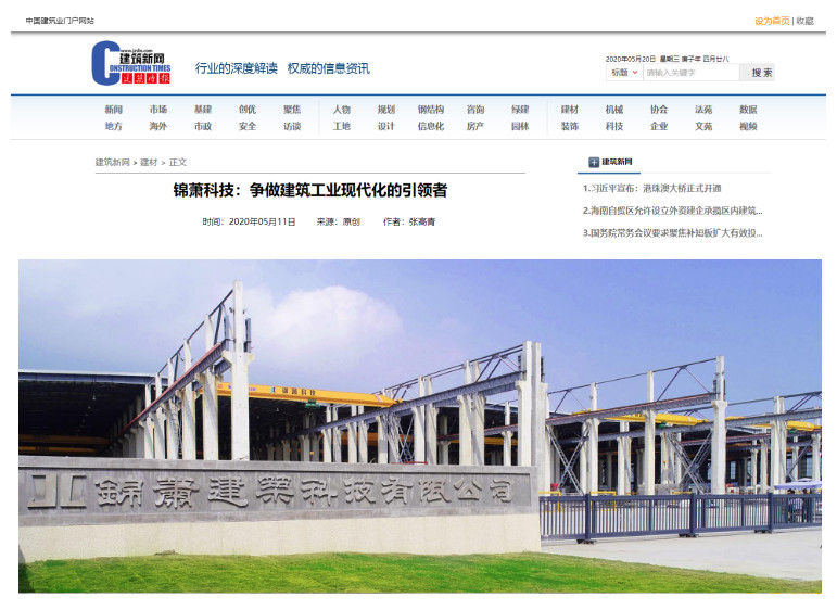 2020年5月18日,《建筑時(shí)報(bào)》第3724期第5版,刊登了《爭(zhēng)做建筑工業(yè)現(xiàn)代化的引領(lǐng)者——錦蕭建筑科技有限公司走訪記》一文,對(duì)錦蕭建筑科技有限公司進(jìn)行了大篇幅報(bào)道。