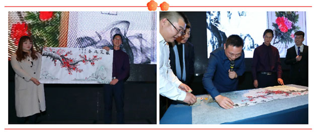 美女帥哥主持已經(jīng)是非常的養(yǎng)眼,優(yōu)美動(dòng)聽(tīng)的歌曲讓會(huì)場(chǎng)變得非常的溫馨。當(dāng)然最激動(dòng)的還是現(xiàn)場(chǎng)作畫(huà)及競(jìng)拍環(huán)節(jié),這幅由公司生產(chǎn)部員工姚玉磊現(xiàn)場(chǎng)創(chuàng)作,并蓋上了李軍董事長(zhǎng)印章的《梅笑迎春》作品, 最后拍出了58000元。