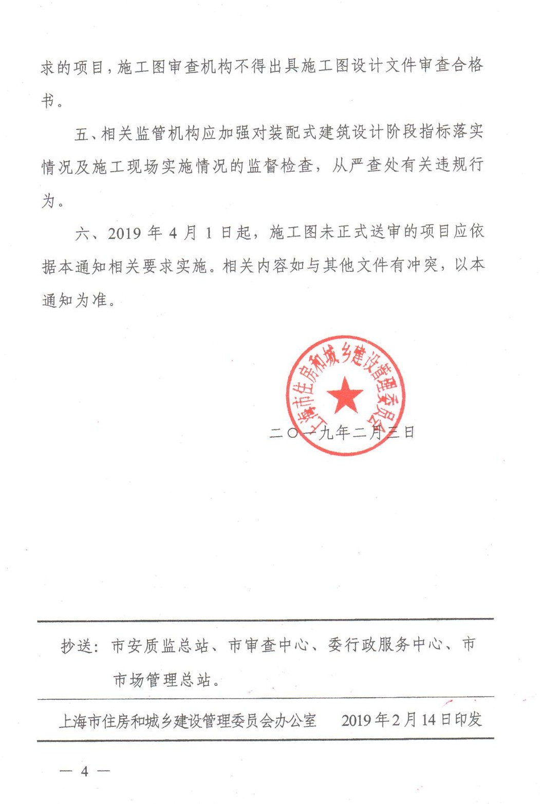 六、2019年4月1日起,施工圖未正式送審的項(xiàng)目應(yīng)依據(jù)本通知相關(guān)要求實(shí)施。相關(guān)內(nèi)容如與其他文件有沖突,以本通知為準(zhǔn)。